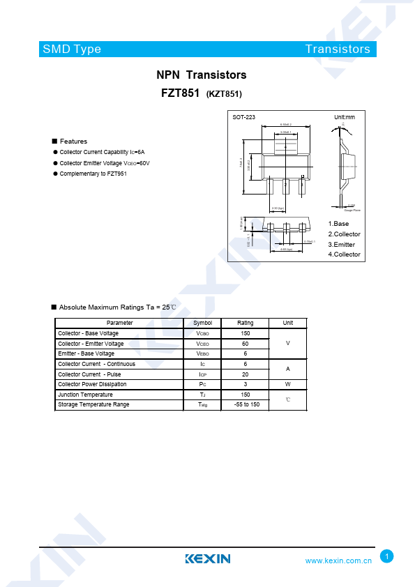 Overview: SMD Type Transistors NPN Transistors FZT851 (KZT851) ■.