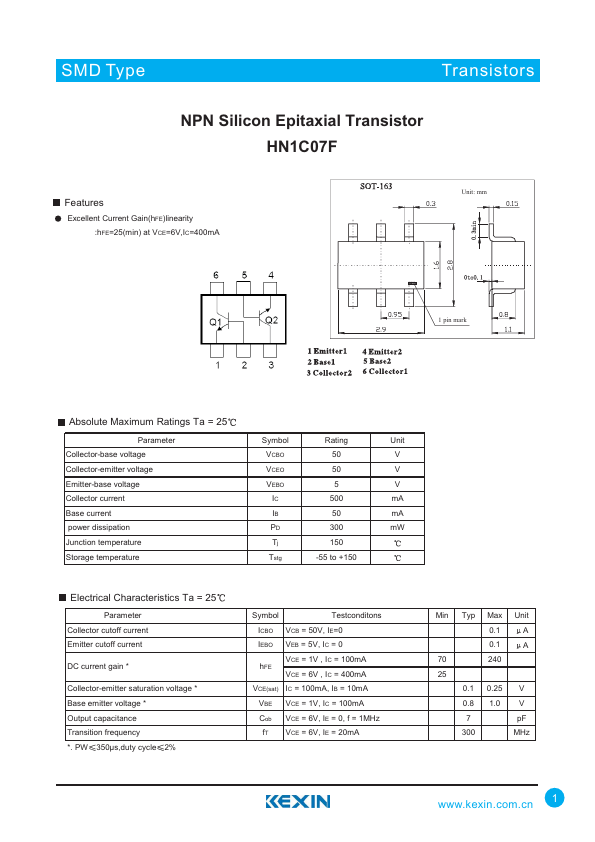 Overview: SMD Type TransistIoCrs NPN Silicon Epitaxial Transistor HN1C07F.