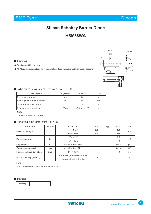 Overview: SMD Type Silicon Schottky Barrier Diode HSM88WA Diodes.