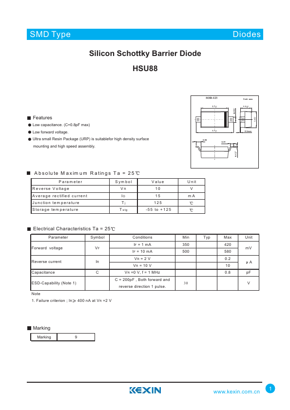 Overview: SMD Type Silicon Schottky Barrier Diode HSU88 Diodes +0.1 0.55 -0.1 +0.1 1.6 -0.