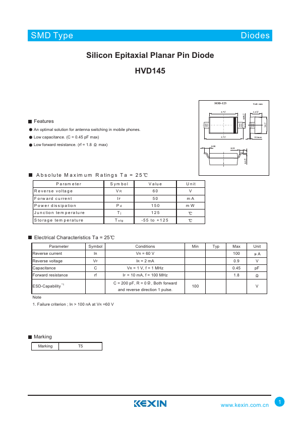 SMD Type Silicon Epitaxial Planar Pin Diode HVD145 Diodes +0.1 0.55 -0.1 +0.1 1.6 -0.1.