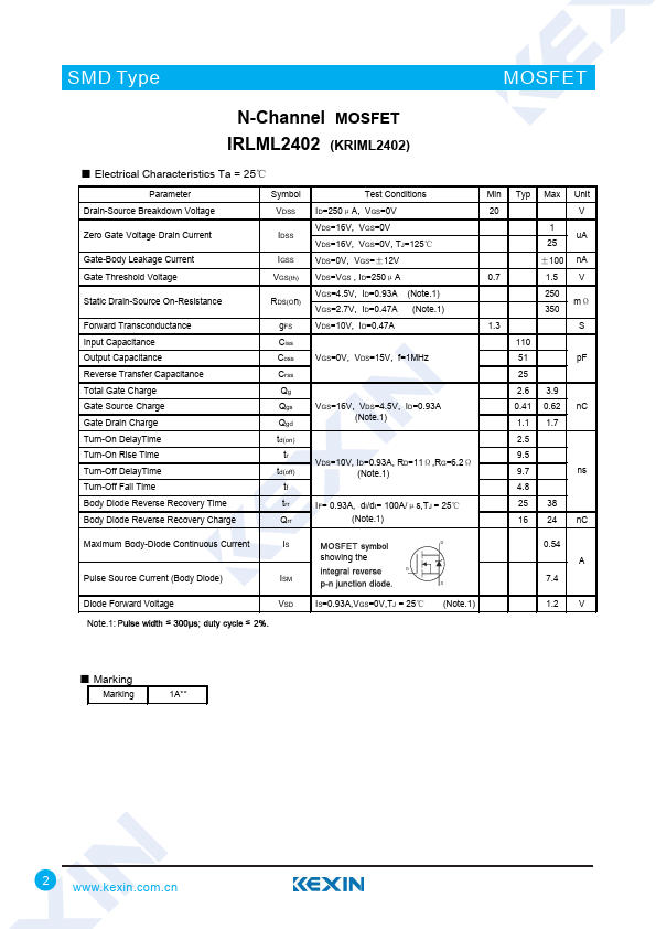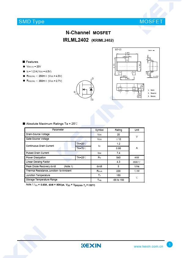 N-Channel MOSFET IRLML2402 (KRlML2402)