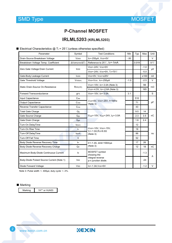 SMD Type P-Channel MOSFET IRLML5203 (KRLML5203) TraMnOsiSsFtoErsT Ƶ Features ƽ VDS (V) =-30V ƽ RDS(ON) İ 98mಳ @ VGS = -10V,ID = -3.0A ƽ RDS(ON) İ 165mಳ @ VGS = -4.5V,ID = -2.6A ƽ Ultra Low On-Resistance ƽ Low Gate Charge +0.1 2.4 -0.1 SOT-23 2.9 +0.1 -0.1 0.4 +0.1 -0.1 3 1 2 0.95 +0.1 -0.1 1.9 +0.1 -0.1 +0.1 1.3 -0.1 0.55 0.4 Unit: mm 0.1 +0.05 -0.01 +0.1 0.97 -0.1 1. Gate 2. Source 3. Drain 0-0.1 +0.1 0.38 -0.1 Ƶ Absolute Maximum Ratings Ta = 25ć Drain-Source Voltage Gate-Source Voltage Parameter Continuous Drain Current, VGS @ -10V Pulsed Drain Current (Note 1) Power Dissipation Linear Derating Factor Thermal Resistance.