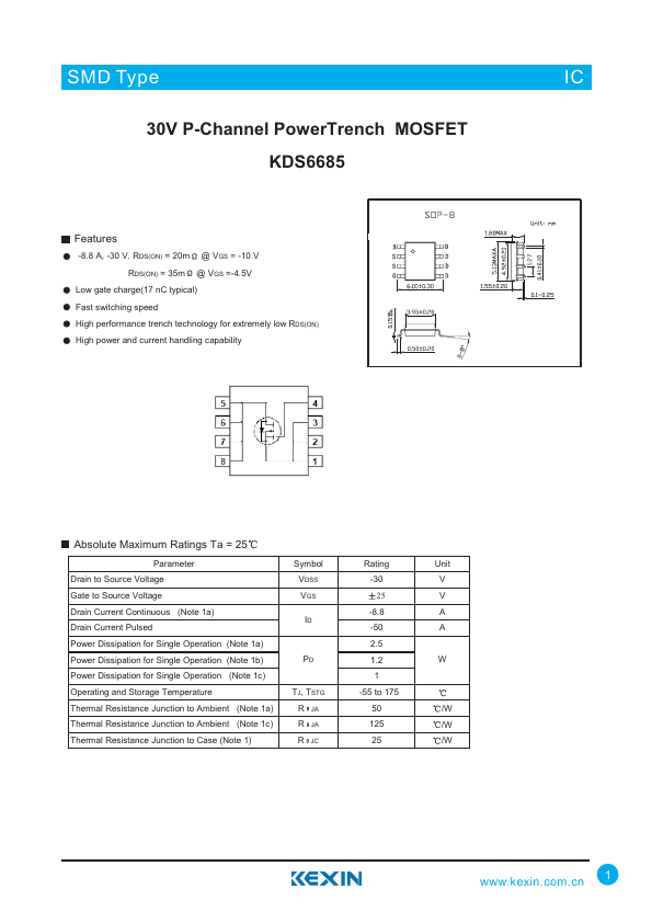 -8.8 A, -30 V. RDS(ON) = 20m @ VGS = -10 V RDS(ON) = 35m @ VGS =-4.5V