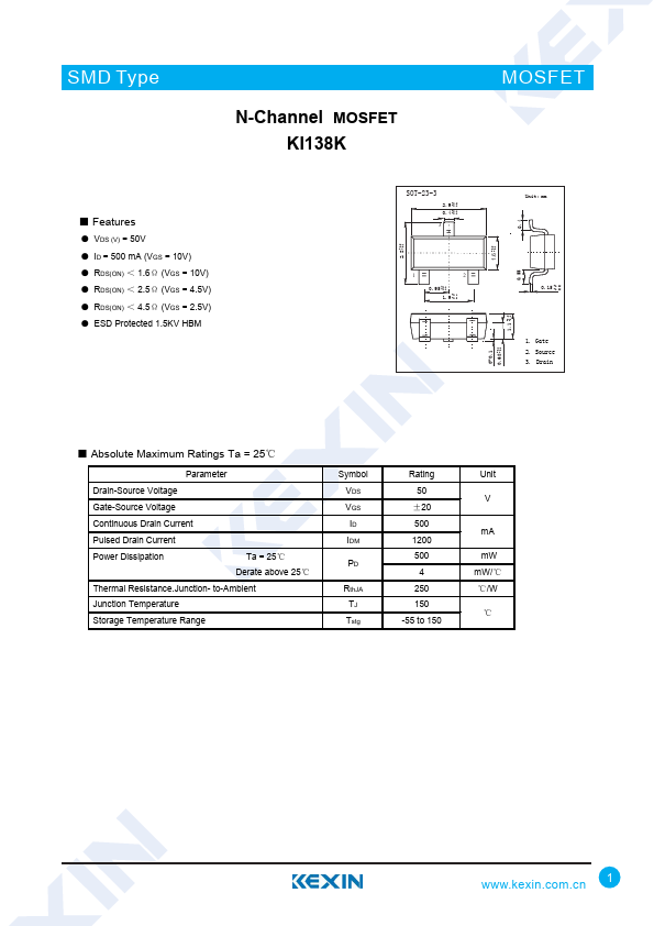 ● VDS (V) = 50V ● ID = 500 mA (VGS = 10V) ● RDS(ON) < 1.6Ω (VGS = 10V) ● RDS(ON) < 2.5Ω (VGS = 4.5V) ● RDS(ON) < 4.5Ω (VGS = 2.5V) ● ESD Protected 1.5KV HBM