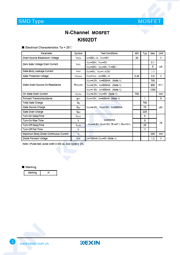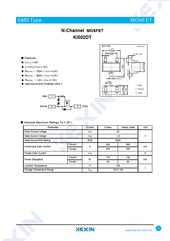 ● VDS (V) = 20V ● ID = 0.5 A (VGS = 10V) ● RDS(ON) < 700mΩ (VGS = 4.5V) ● RDS(ON) < 850mΩ (VGS = 2.5V) ● RDS(ON) < 1.25Ω (VGS = 1.8V) ● Gate-Source ESD Protected: 2000 V