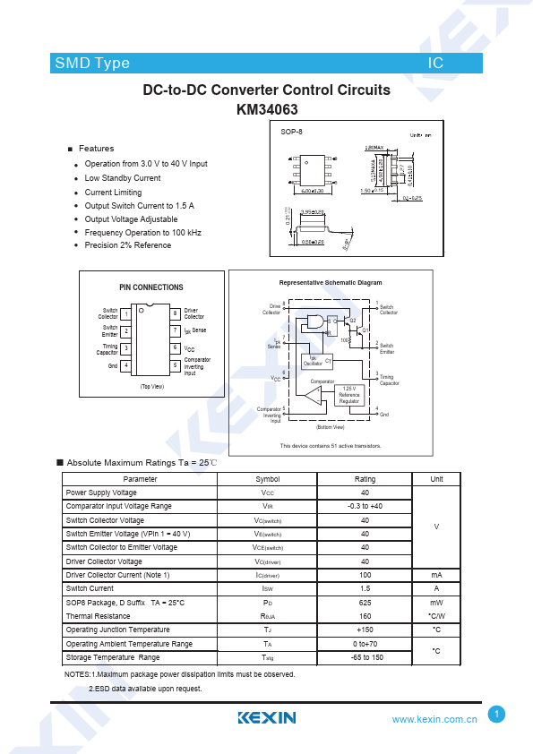 Ɣ Operation from 3.0 V to 40 V Input Ɣ Low Standby Current Ɣ Current Limiting Ɣ Output Switch Current to 1.5 A Ɣ Output Voltage Adjustable Ɣ Frequency Operation to 100 kHz Ɣ Precision 2% Reference