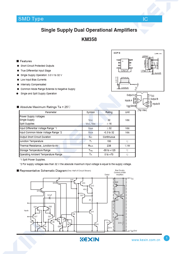 ƽ Short Circuit Protected Outputs ƽ True Differential Input Stage ƽ Single Supply Operation: 3.0 V to 32 V ƽ Low Input Bias Currents ƽ Internally Compensated ƽ Common Mode Range Extends to Negative Supply ƽ Single and Split Supply Operation