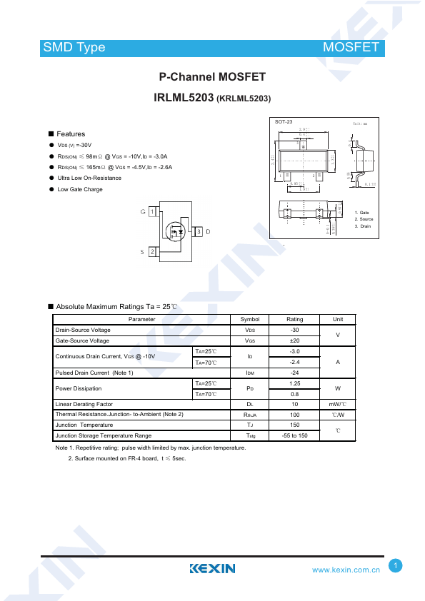 P-Channel MOSFET IRLML5203 (KRLML5203)