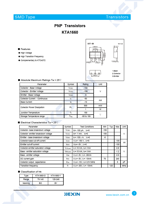 Overview: SMD Type PNP Transistors KTA1660 Transistors ■.