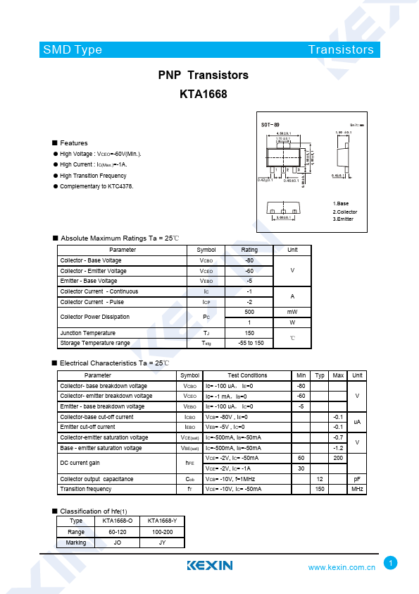 Overview: SMD Type PNP Transistors KTA1668 Transistors ■.