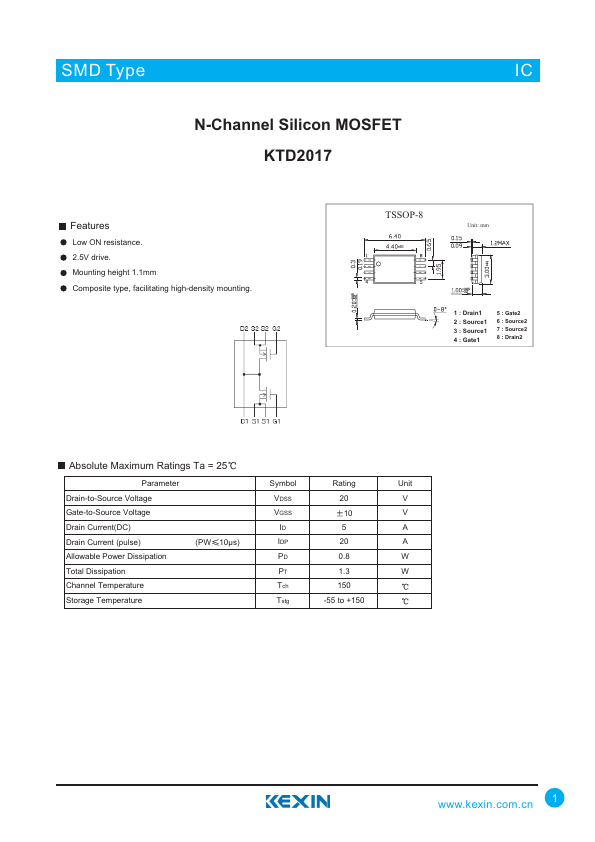 Low ON resistance. 2.5V drive. Mounting height 1.1mm Composite type, facilitating high-density mounting.