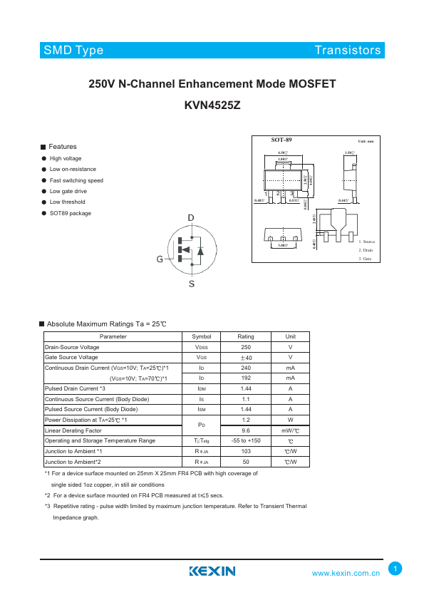 High voltage Low on-resistance Fast switching speed Low gate drive Low threshold SOT89 package