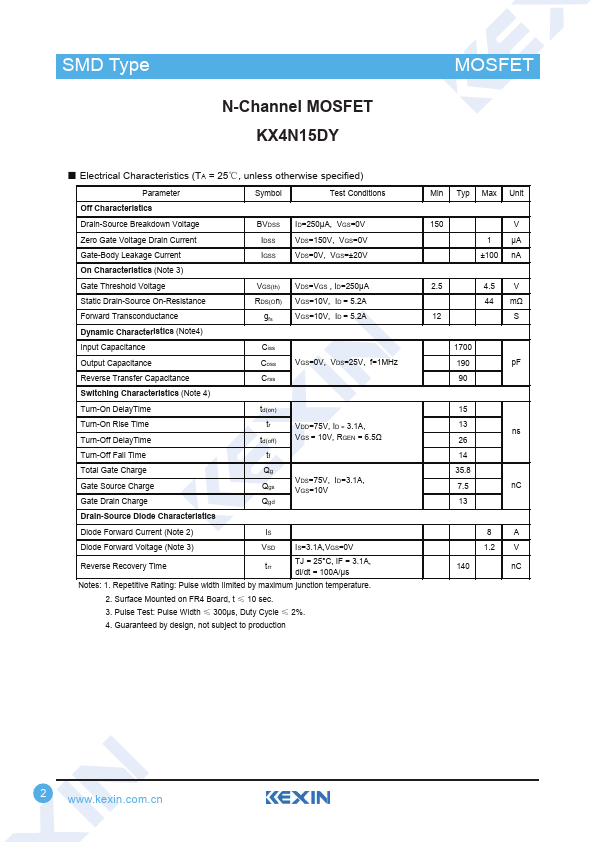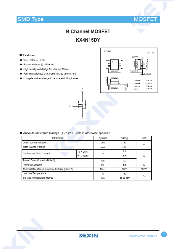 ● VDS =150V,ID =5.2A ● RDS(ON) <44mΩ @ VGS=10V ● High density cell design for ultra low Rdson ● Fully characterized avalanche voltage and current ● Low gate to drain charge to reduce switching losses