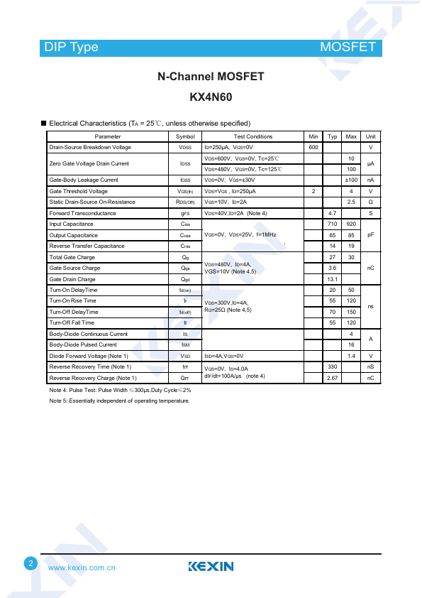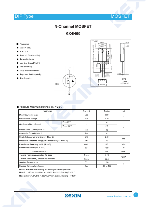 ƽ VDS S = 600V ƽ ID = 4.0 A ƽ Rdson < 2.5വ(Vgs=10V) ƽ Low gate charge ƽ Low Crss (typical 14pF ) ƽ Fast switching ƽ 100% avalanche tested ƽ Improved dv/dt capability ƽ RoHS product