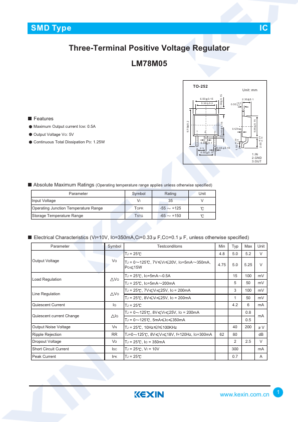 Maximum Output current IOM: 0.5A Output Voltage VO: 5V Continuous Total Dissipation PD: 1.25W