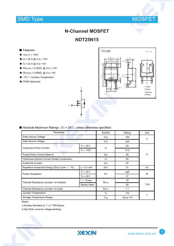 ƽ VDS (V) = 150V ƽ ID = 25 A @ VGS = 10V ƽ ID = 23 A @ VGS = 6V ƽ RDS(ON) < 0.052 @ VGS = 10V ƽ RDS(ON) < 0.060 @ VGS = 6V ƽ 175 ć Junction Temperature ƽ PWM Optimized