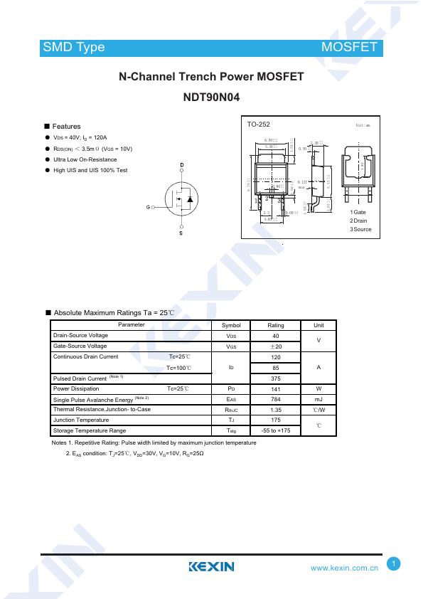 ƽ VDS = 40V; ID = 120A ƽ RDS(ON) ˘ 3.5m¡ (VGS = 10V) ƽ Ultra Low On-Resistance ƽ High UIS and UIS 100% Test