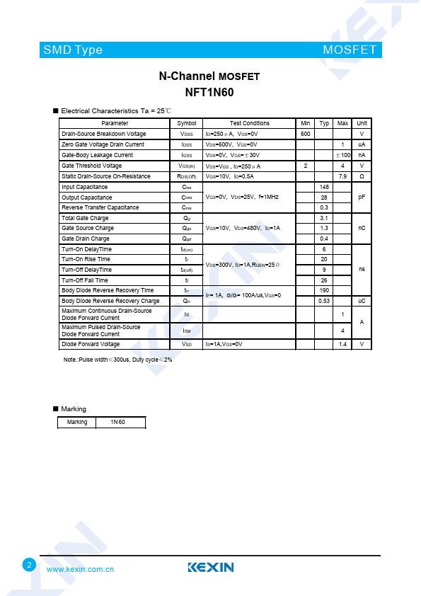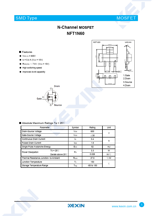 ● VDS (V) = 600V ● ID = 0.4 A (VGS = 10V) ● RDS(ON) < 7.9Ω (VGS = 10V) ● High switching speed ● Improved dv/dt capability