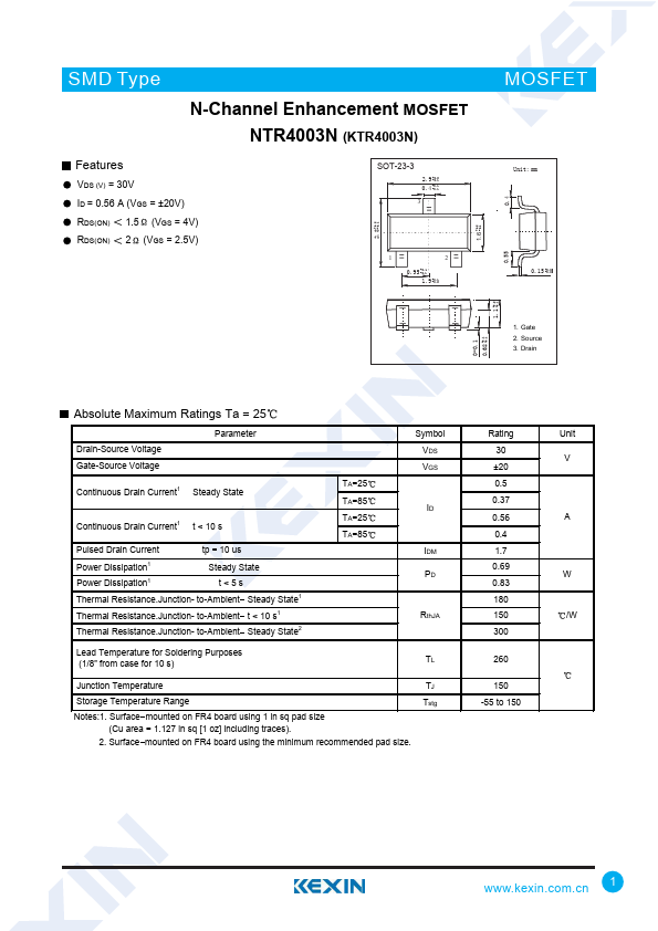 N-Channel Enhancement MOSFET NTR4003N (KTR4003N)