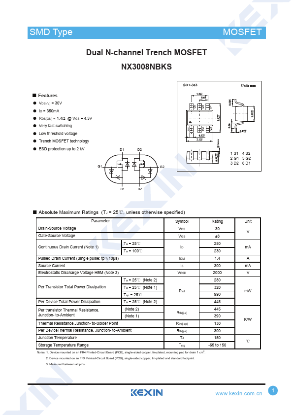 ● VDS (V) = 30V ● ID = 350mA ● RDS(ON) < 1.4Ω @ VGS = 4.5V ● Very fast switching ● Low threshold voltage ● Trench MOSFET technology ● ESD protection up to 2 kV