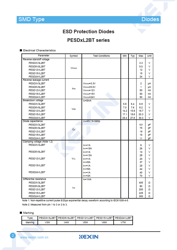 SMD Type TransDisiotodress ESD Protection Diodes PESDxL2BT series.
