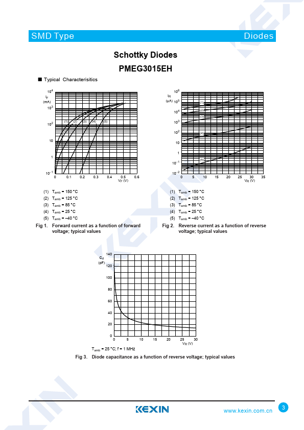 Note.2:Device mounted on an FR4 PCB, single-sided copper, tin-plated, mounting pad for cathode 1 cm2 .kexin..cn 1 SMD Type Schottky Diodes PMEG3015EH ■ Electrical Characteristics Ta = 25℃ Parameter Reverse breakdown voltage Forward voltage Reverse voltage leakage current Junction capacitance Symbol Test Conditions VR IR= 100 uA IF= 1 mA IF= 10 mA IF= 100 mA VF IF= 500 mA IF= 1 A IF= 1.5 A VR= 10 V IR VR= 30 V Cj VR= 1V, f= 1MHz Note.Pulse test: tp ≤ 300 us;