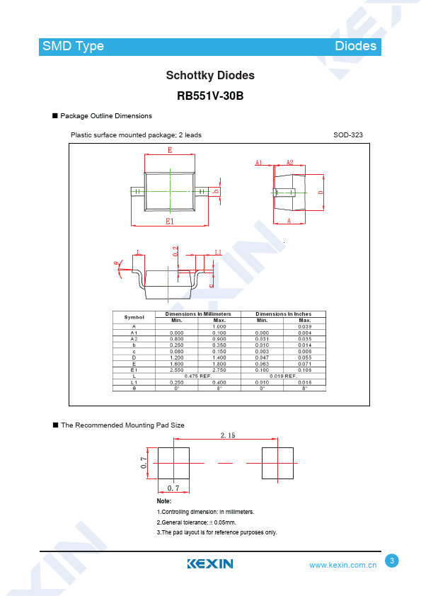 2 leads Diodes SOD-323 Ƶ The Remended Mounting Pad Size Note: 2.General tolerance:f0.05mm. 3.The pad layout is for reference purposes only.