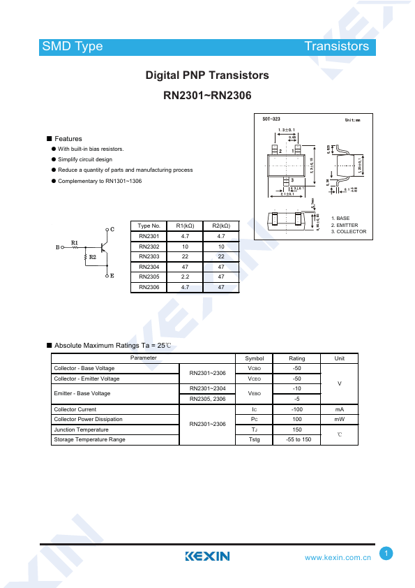 Overview: SMD Type Digital PNP Transistors RN2301~RN2306 TTrraannssiissttoorrss.