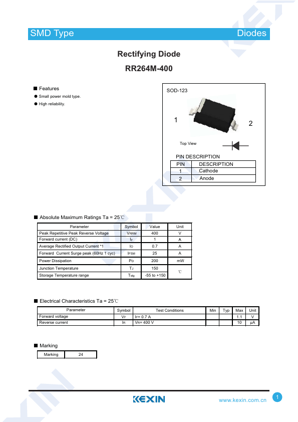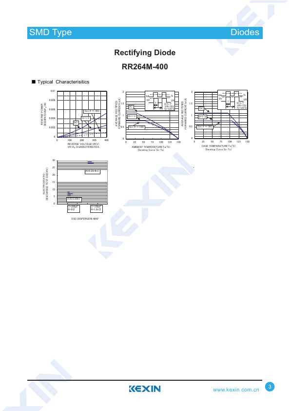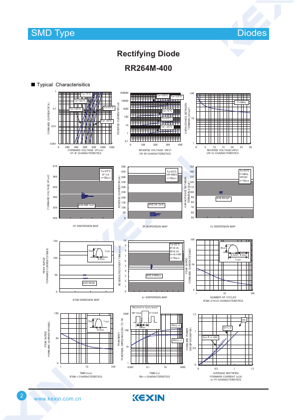 PIN DESCRIPTION 1 Cathode 2 Anode Ƶ Absolute Maximum Ratings Ta = 25ć Parameter Symbol Value Unit Peak Repetitive Peak Reverse Voltage VRRM 400 V Forward current (DC) IF 1 A Average Rectified Output Current *1 IO 0.7 A Forward Current Surge peak (60Hz 1 cyc) IFSM 25 A Power Dissipation PD 200 mW Junction Temperature Storage Temperature range TJ 150 ć Tstg -55 to +150 Ƶ Electrical Characteristics Ta = 25ć Parameter Forward voltage Reverse current Symbol VF IR Test Conditions IF= 0.7 A VR= 400 V Ƶ Marking Marking 24 Min Typ Max Unit 1.1 V 10 ȝA .kexin..cn 1 SMD Type Rectifying Diode RR264M-400 TransDisiotodress Ƶ Typical Characterisitics 1 Ta=75㷄 Ta=125㷄 0.1 Ta=150㷄 100000 Ta=25㷄 10000 1000 REVERSE CURRENT:IR(nA) FORWARD CURRENT:IF(A) 100 Ta=-25㷄 0.01 10 1 0.001 0 200 400 600 800 1000 1200 FORWARD VOLTAGE䋺VF(mV) VF-IF CHARACTERISTICS 0.1 0 Ta=150㷄 Ta=125㷄 Ta=75㷄 Ta=25㷄 Ta=-25㷄 100 200 300 400 REVERSE VOLTAGE䋺VR(V) VR-IR CHARACTERISTICS CAPACITANCE BETWEEN TERMINALS:Ct(pF) 100 10 1 0 f=1MHz 5 10 15 20 25 30 REVERSE VOLTAGE:VR(V) VR-Ct CHARACTERISTICS FORWARD VOLTAGE:VF(mV) 970 500 Ta=25㷄 450 IF=1A 960 n=30pcs 400 350 REVERSE CURRENT:IR(nA) 950 300 250 940 200 150 AVE:940.7mV 930 100 50 920 0 VF DISPERSION MAP 150 Ta=25㷄 140 VR=400V n=30pcs 130 120 CAPACITANCE BETWEEN TERMINALS:Ct(pF) 110 100 90 80 AVE:34.13nA 70 60 50 IR DISPERSION MAP Ta=25㷄 f=1MHz VR=0V n=10pcs AVE:99.5pF Ct DISPERSION MAP PEAK SURGE FORWARD CURRENT:IFSM(A) PEAK SURGE FORWARD CURRENT:IFSM(A) RESERVE RECOVERY TIME:trr(us) 150 10 9 Ifsm Ifsm 11ccyycc 8 7 100 88.3.3mmss 6 5 100 Ta=25㷄 IF=0.1A IR=0.1A Irr=0.1*IR n=10pcs 50 Ifsm 8.3ms 8.3ms 1cyc 4 50 3 AVE:4.860us AVE:44.0A 0 IFSM DISRESION MAP 2 1 0 trr DISPERSION