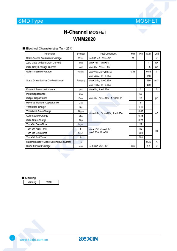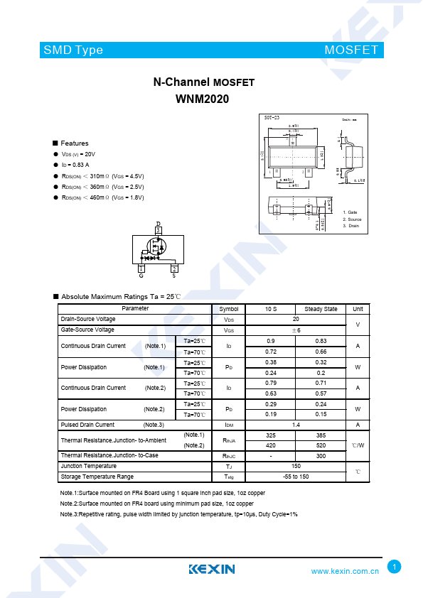 ● VDS (V) = 20V ● ID = 0.83 A ● RDS(ON) < 310mΩ (VGS = 4.5V) ● RDS(ON) < 360mΩ (VGS = 2.5V) ● RDS(ON) < 460mΩ (VGS = 1.8V)