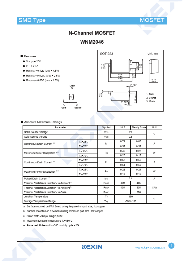 ● VDS (V) = 20V ● ID = 0.71 A ● RDS(ON) < 0.42Ω (VGS = 4.5V) ● RDS(ON) < 0.500Ω (VGS = 2.5V) ● RDS(ON) < 0.60Ω (VGS = 1.8V)