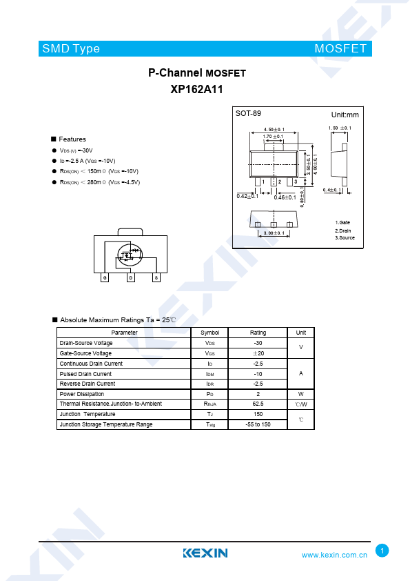 ● VDS (V) =-30V ● ID =-2.5 A (VGS =-10V) ● RDS(ON) < 150mΩ (VGS =-10V) ● RDS(ON) < 280mΩ (VGS =-4.5V)