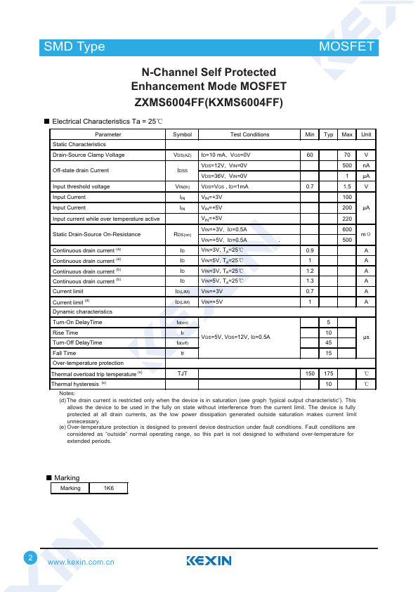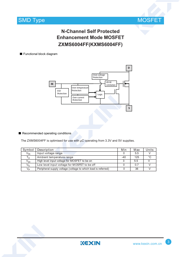 SMD Type TraMnOsiSsFtoErsT N-Channel Self Protected Enhancement Mode MOSFET ZXMS6004FF(KXMS6004FF) ƵFeatures ƽ Compact high power dissipation package ƽ Low input current ƽ Logic Level Input (3.3V and 5V) ƽ Short circuit protection with auto restart ƽ Over voltage protection (active clamp) ƽ Thermal shutdown with auto restart ƽ Over-current protection ƽ Input Protection (ESD) ƽ High continuous current rating +0.1 2.4 -0.1 SOT-23 2.9 +0.1 -0.1 0.4 +0.1 -0.1 3 1 2 0.95 +0.1 -0.1 1.9 +0.1 -0.1 +0.1 1.3 -0.1 +0.1 0.97 -0.1 0.55 0.4 Unit: mm 0.1 +0.05 -0.01 1. IN 2. Source 3. Drain 0-0.1 +0.1 0.38 -0.1 Ƶ Absolute Maximum Ratings Ta = 25ć Parameter Drain-Source Voltage Drain-Source voltage for short circuit protection Continuous input Voltage Continuous input Current -0.