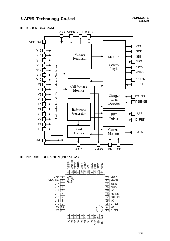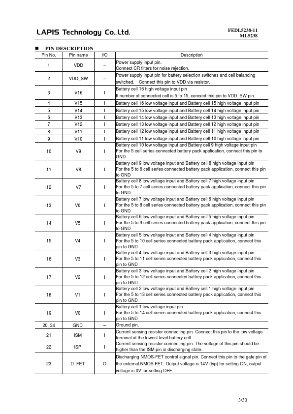 The ML5238 is analog front end IC for 16 series Lithium Ion secondary battery pack protection system. The ML5238 provides the function of cell voltage monitoring, charge/discharge current monitoring function, and it can detect over-charge/over-discharge of each battery cell charge/discharge over-current. The ML5238 has short current detecting function which can turn off the external charge/discharge MOS-FET without external MCU.