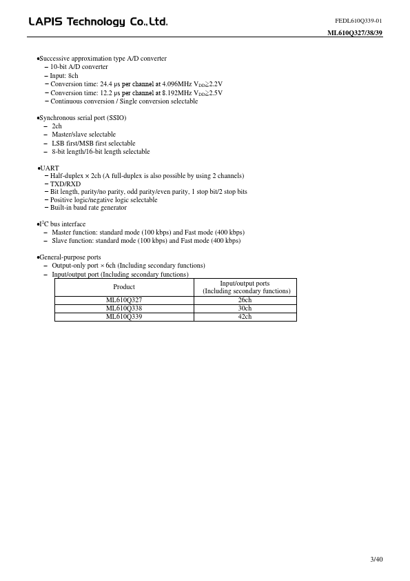 Equipped with a 8-bit CPU nX-U8/100, the ML610Q327/338/339 is a high-performance 8-bit CMOS microcontroller that integrates a wide variety of peripherals such as timer, PWM, UART, I2C bus interface, synchronous serial port, successive approximation type 10-bit A/D converter and voice output function. The nX-U8/100 CPU is capable of executing instructions efficiently on a one-instruction-per-clock-pulse basis through parallel processing by the 3-stage pipelined architecture.
