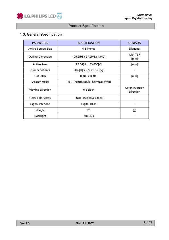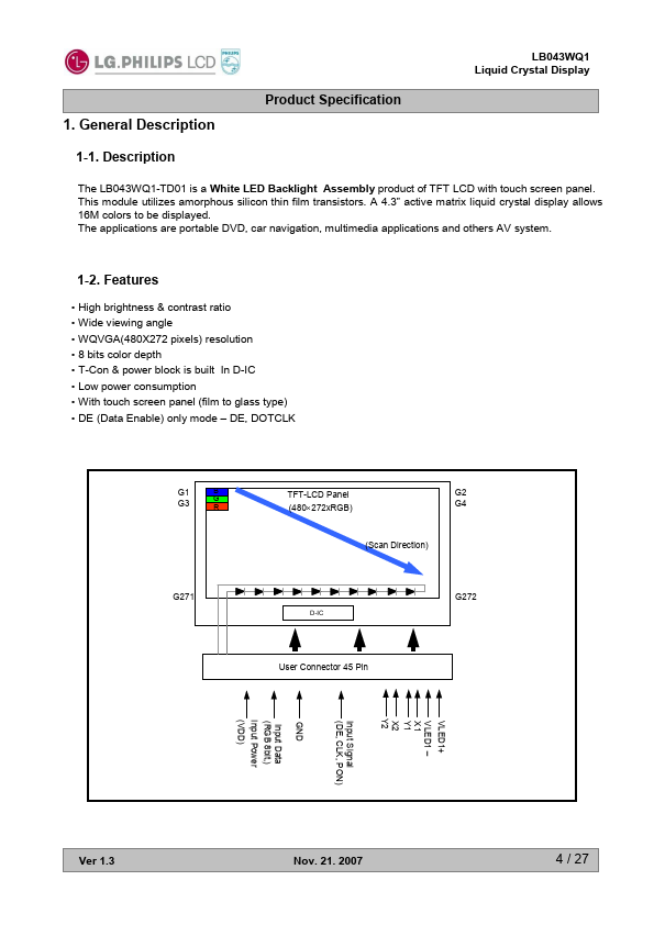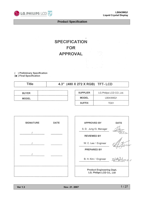 LB043WQ1-TD01 Details Part number LB043WQ1-TD01 Datasheet LB043WQ1-TD01 / LB043WQ1 Datasheet PDF (Download) File Size 1.24 MB Manufacturer LG Electronics Description TFT LCD