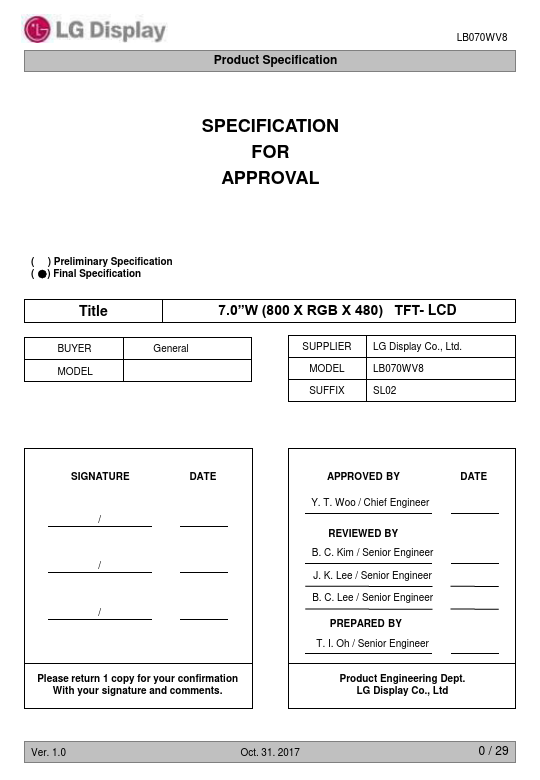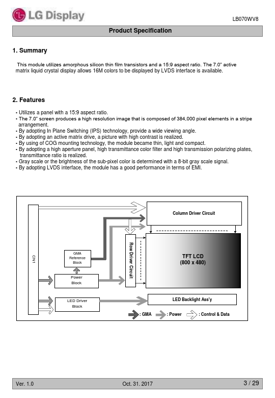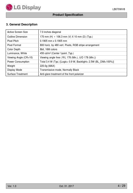 Active Screen Size Outline Dimension Pixel Pitch Pixel Format Color Depth Luminance, White Viewing Angle (CR>10) Power Consumption Weight Display Mode Surface Treatment 7.0 inches diagonal 170 mm (H) × 106.3 mm (V) X 10 mm (D) (Typ.) 0.1905 mm x 0.1905 mm 800 horiz. 2017 4 / 29 Product Specification LB070WV8 4. Ratings The following items are maximum values which, if exceeded, may cause faulty operation or damage to...