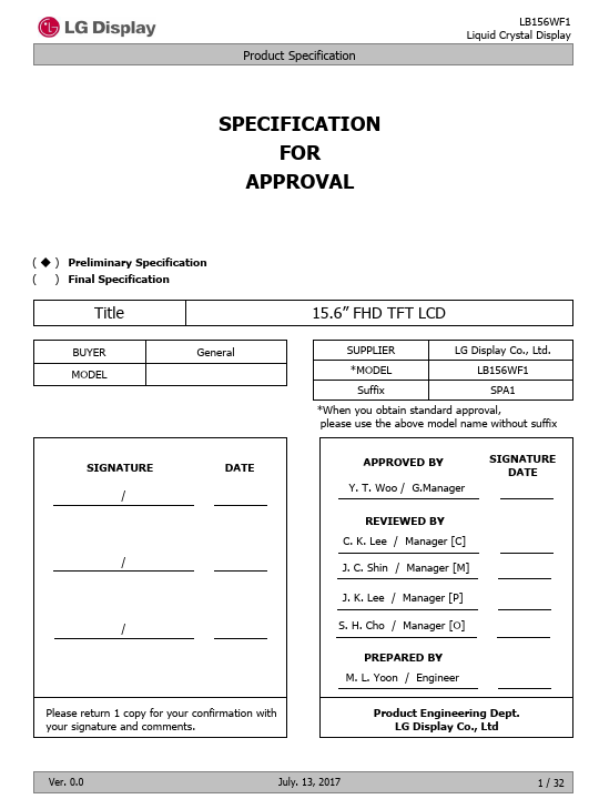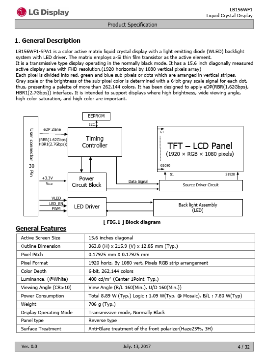 LB156WF1-SPA1 is a color active matrix liquid crystal display with a light emitting diode (WLED) backlight system with LED driver. The matrix employs a-Si thin film transistor as the active element. It is a transmissive type display operating in the normally black mode.