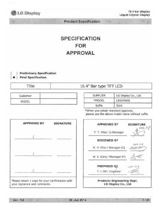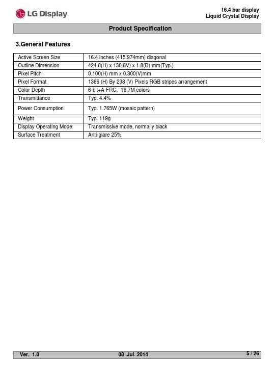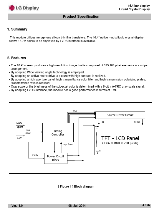 This module utilizes amorphous silicon thin film transistors. The 16.4” active matrix liquid crystal display allows 16.7M colors to be displayed by LVDS interface is available.
