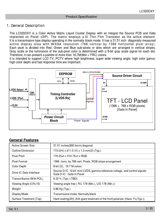 The LC320DXY is a Color Active Matrix Liquid Crystal Display with an integral the Source PCB and Gate implanted on Panel (GIP). The matrix employs a-Si Thin Film Transistor as the active element. It is a transmissive type display operating in the normally black mode.