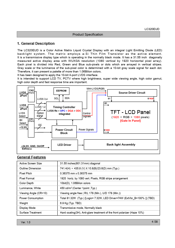 The LC320EUD is a Color Active Matrix Liquid Crystal Display with an integral Light Emitting Diode (LED) backlight system. The matrix employs a-Si Thin Film Transistor as the active element. It is a transmissive display type which is operating in the normally black mode.