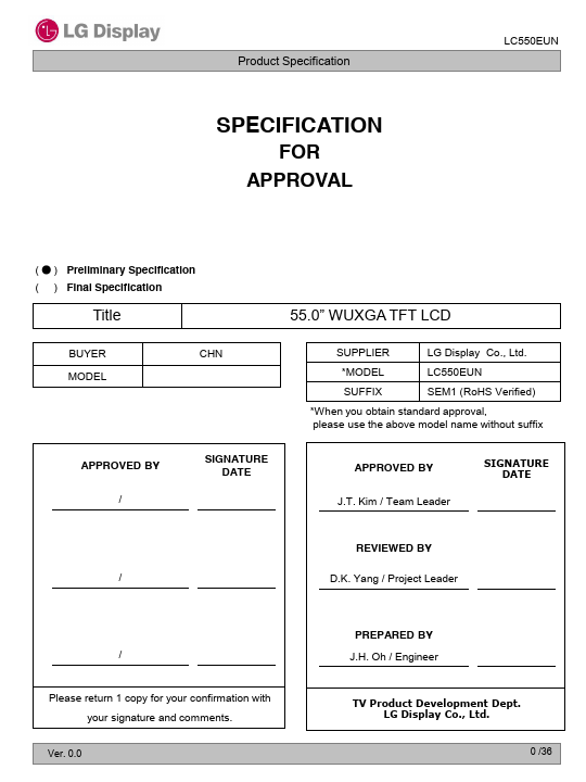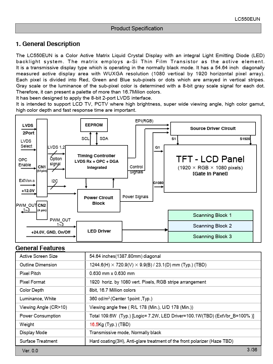 The LC550EUN is a Color Active Matrix Liquid Crystal Display with an integral Light Emitting Diode (LED) backlight system. The matrix employs a-Si Thin Film Transistor as the active element. It is a transmissive display type which is operating in the normally black mode.