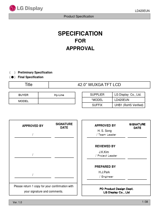The LD420EUN is a Color Active Matrix Liquid Crystal Display with an integral Light Emitting Diode (LED) backlight system. The matrix employs a-Si Thin Film Transistor as the active element. It is a transmissive display type which is operating in the normally black mode.