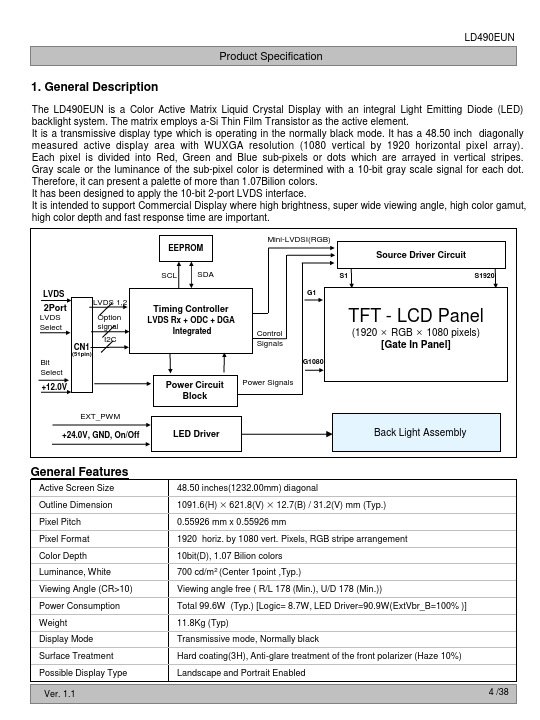 The LD490EUN is a Color Active Matrix Liquid Crystal Display with an integral Light Emitting Diode (LED) backlight system. The matrix employs a-Si Thin Film Transistor as the active element. It is a transmissive display type which is operating in the normally black mode.