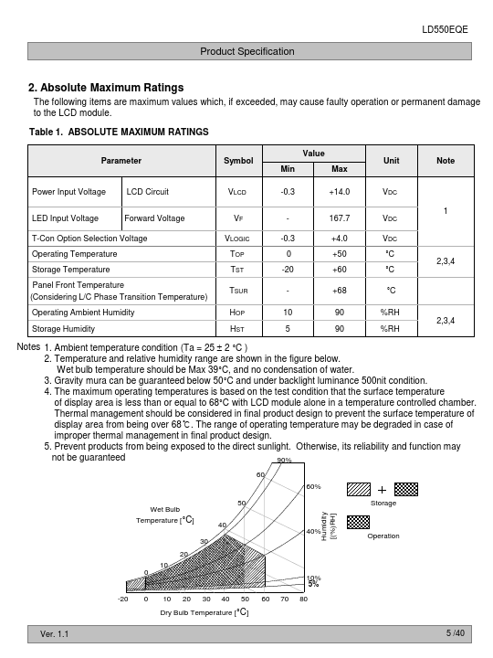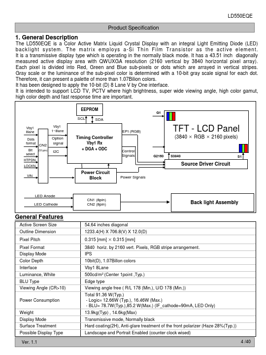 The LD550EQE is a Color Active Matrix Liquid Crystal Display with an integral Light Emitting Diode (LED) backlight system. The matrix employs a-Si Thin Film Transistor as the active element. It is a transmissive display type which is operating in the normally black mode.