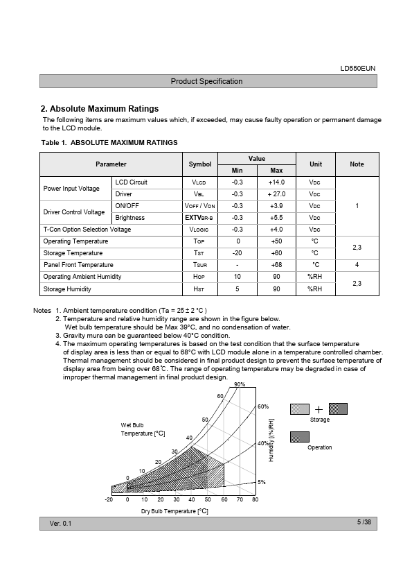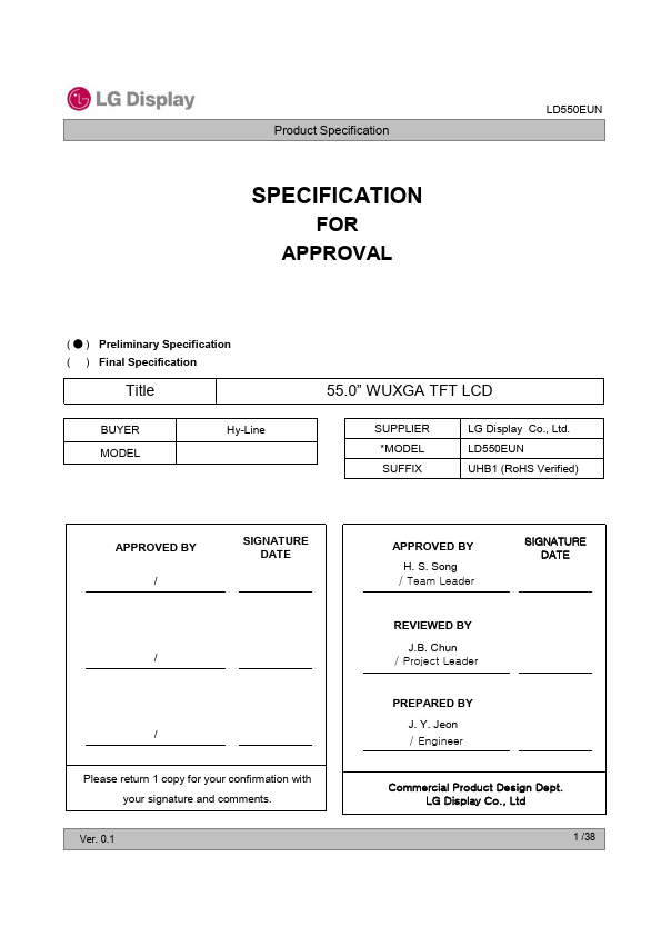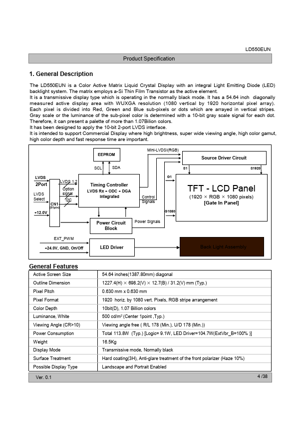 The LD550EUN is a Color Active Matrix Liquid Crystal Display with an integral Light Emitting Diode (LED) backlight system. The matrix employs a-Si Thin Film Transistor as the active element. It is a transmissive display type which is operating in the normally black mode.
