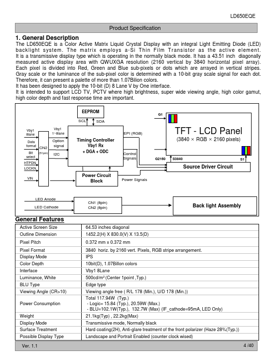 The LD650EQE is a Color Active Matrix Liquid Crystal Display with an integral Light Emitting Diode (LED) backlight system. The matrix employs a-Si Thin Film Transistor as the active element. It is a transmissive display type which is operating in the normally black mode.