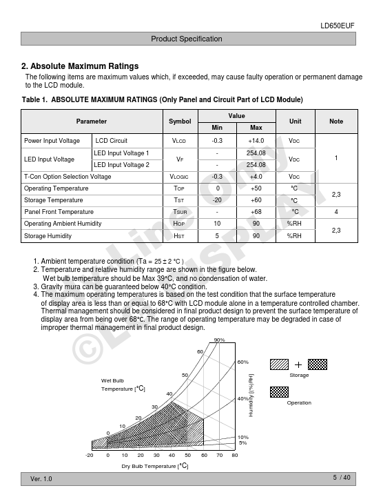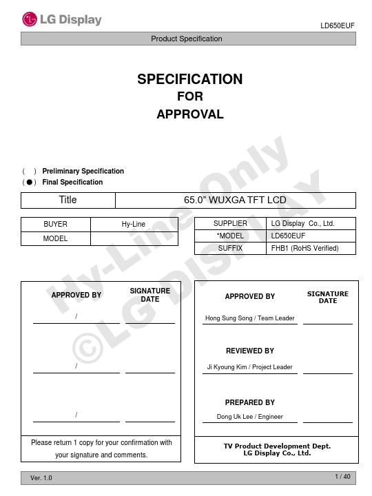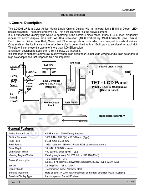 The LD650EUF is a Color Active Matrix Liquid Crystal Display with an integral Light Emitting Diode (LED) backlight system. The matrix employs a-Si Thin Film Transistor as the active element. It is a transmissive display type which is operating in the normally black mode.