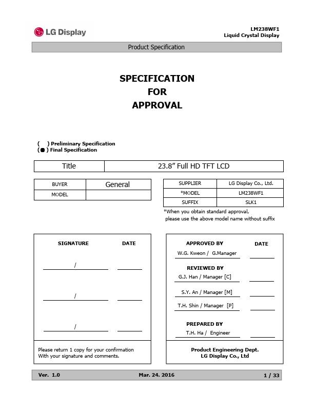 LM238WF1 is a Color Active Matrix Liquid Crystal Display with a Light Emitting Diode(WLED) backlight system without LED driver. The matrix employs a-Si Thin Film Transistor as the active element. It is a transmissive type display operating in the normally black mode.